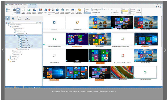 탐색기 모드 썸네일 보기에서 PC 모니터 (여러 모니터 포함)를 볼 수 있으며 현재 활동을 시각적으로 볼 수 있습니다. 축소판 크기는 운영자의 요구에 맞게 변경할 수 있습니다. 선택한 부서 (예 : 금융 또는 교사)의 경우 미리보기 이미지가 흐려지도록 개인 정보 모드를 설정할 수 있습니다.