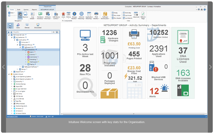 NetSupport DNA는 화면 상 및 인쇄 최적화 된 보고 기능을 제공합니다. 화면상의 보고서 /보기에는 지원되는 막대 및 원형 차트와 모든 주요 요약 데이터에 대한 "실시간"드릴 다운 기능이 제공됩니다. 개별 장치, 사용자 및 부서에 대한보고뿐만 아니라 NetSupport DNA는 동적 그룹을 제공합니다. 이들은 사용자가 정의하고 주요 회사 트리에 추가됩니다. 예를 들어, 동적 그룹은 업그레이드 가능한 PC를 식별 할 수 있으며 "XX 'GB RAM이 넘는 모든 PC,'XX 'GB가 무료 인 모든 PC와 같은 필수 기준과 일치하는 그룹에서 자동으로 생성됩니다 디스크 공간 및 XX 프로세서 유형 "등등.
