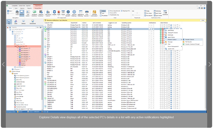 상세보기는 자세히 보기에서 선택한 PC의 모든 세부 정보를 목록에 표시하여 활성화 된 알림을 강조 표시하여 즉각적인 주의가 필요한 PC를 쉽게 식별 할 수 있도록 합니다. 또한 각 PC에 적용되는 모든 활성 정책과 실시간 네트워크 트래픽, CPU 및 각 PC의 메모리 사용량과 같은 PC 성능 데이터를 시각적으로 요약하여 보여줍니다. 또한 PC를 마우스 오른쪽 버튼으로 클릭하면 전원 켜기 / 끄기, 채팅, NetSupport Manager 실행, 메시지 전송 등과 같은 PC 관련 기능을 즉시 시작할 수 있습니다.