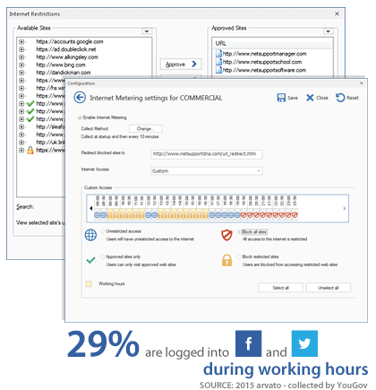 인터넷 계량 모듈은 방문한 각 URL의 시작 및 종료 시간과 페이지에서 소비된 활성 시간을 포함하여 사용자가 각 PC에서 수행 한 모든 인터넷 활동에 대한 자세한 요약을 제공합니다. 결과는 특정 장치에서의 활동 또는 사용자가 작업 한 위치에 관계없이 검토 할 수 있습니다. 당연히 효과적인 정책을 지원하는 열쇠는 효과적인 통제를 제공하는 것입니다. NetSupport DNA를 사용하면 인터넷 사용을 완벽하게 관리 할 수 있으며 승인되고 제한된 URL 및 / 또는 하위 URL 목록을 중앙에서 적용 할 수 있습니다. NetSupport DNA를 적용하면 모든 웹 사이트에 제한 없이 액세스 할 수 있으며, 회사가 승인 한 특정 웹 사이트에 대한 액세스가 제한되거나 부적절하다고 표시된 특정 사이트에 대한 액세스를 차단할 수 있습니다.